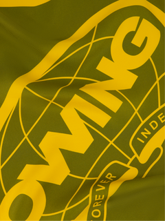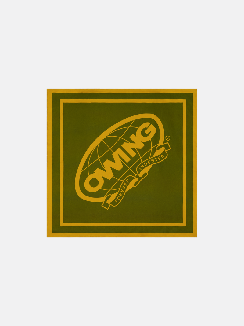 Delicate silk twill bandana featuring the Owing Global banner logo with hand rolled hem finishing.